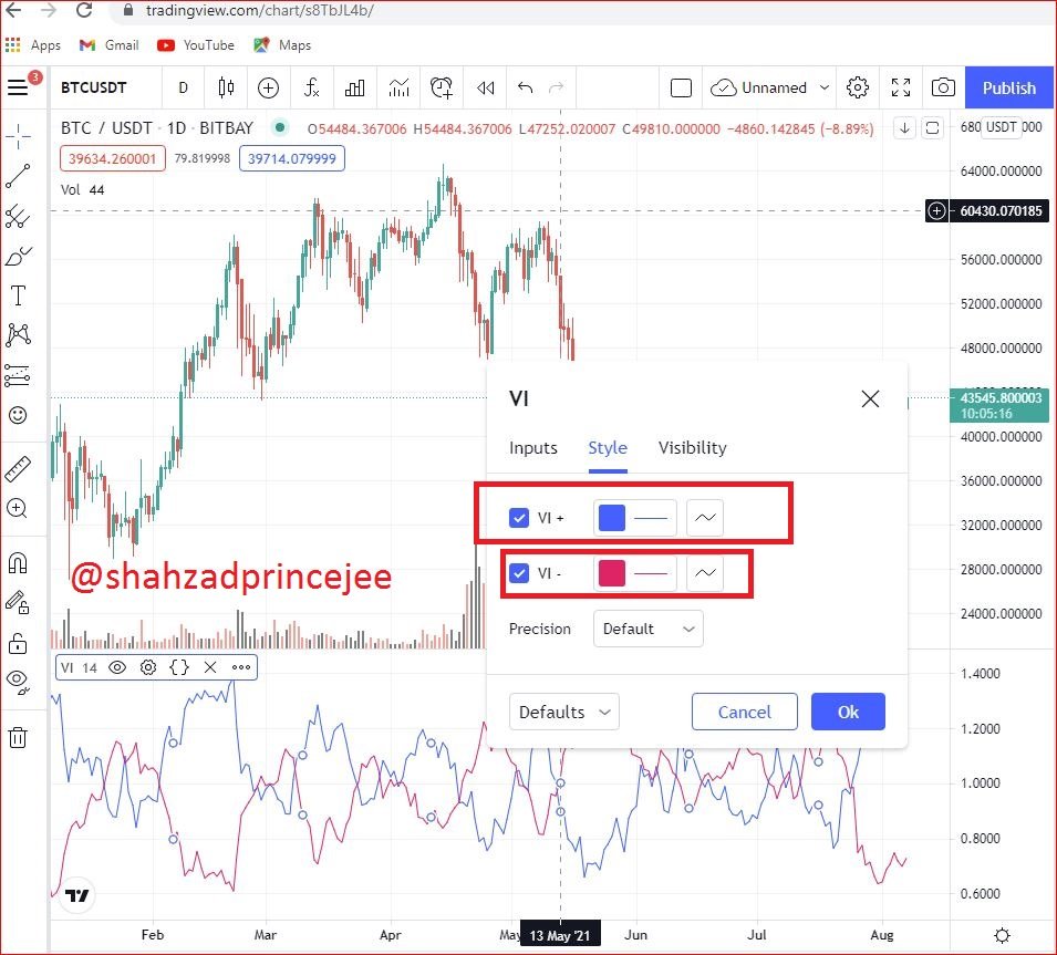 As we can see all incons , and the different icons have own different working such as eyes icon will work for hide something and the "x" icon close the vortex indicator chart and so on others . We click only on the setting and input the length and change the style , we put the V+ of colour blue and V- of colour red .