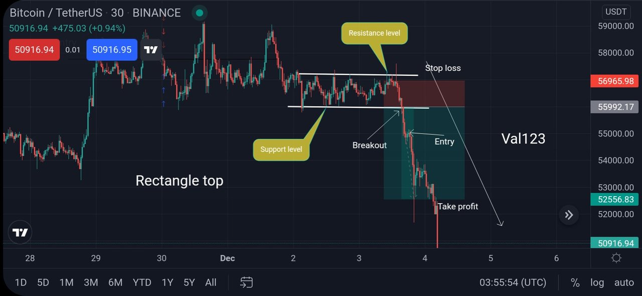 Looking at the chart above is a trade set up i made using the rectangle top pattern, as we can see at the chart, when i drew two horizontal trendline, forming rectangle pattern and its located at the top of the chart, now this pattern is best for trading breakout, when the market is moving up and down between the support and resistance point, there was a breakout at 55992.17 , the market starts bearishing, then i have to take my entry at 55000.00 after that i set up my stop loss at 56965.98 which is set at the top and then below, i set my take profit at 52556.83. This particular set up is called shorting position, because i notice that the market is bearishing, so i entered a sell position and short the market. Once the price hits my target, it will execute.