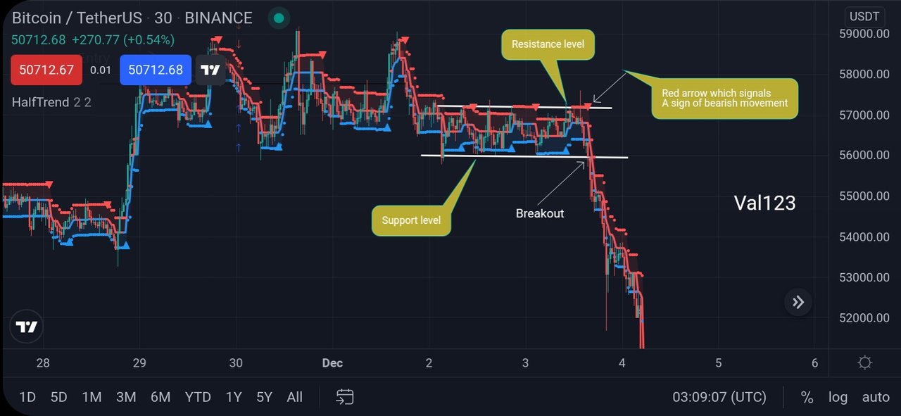 The chart above, are technical analysis of rectangle pattern and also combining the half trend indicator with, in other to get a better result on the market movement. Now at the chart, when a rectangle patter wad form, the price keep hitting the support and the resistance point with trending up or trending down, so finally a breakout occurs, so now because am making use of the half trend indicators, i was shown a signal, a red arrow appears at the top of the chart after thr brekout, this shows that the market is about to move to the negative side which bearish movemnt.