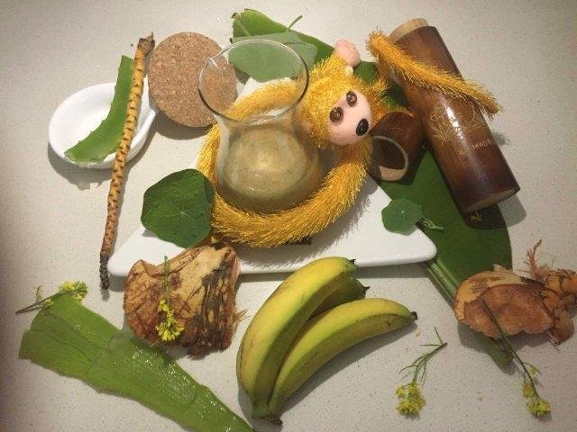 In your blender, put the bananas, aloe vera, mint leaves, coconut flesh and flowers!