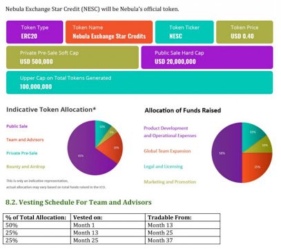 NESC(Nebula Exchange Star Credit) is officially Nebula token. Transaction can be effected in NESC and thus qualify the user to 50% discount in fee. Also NESC will be accepted for project listing.
