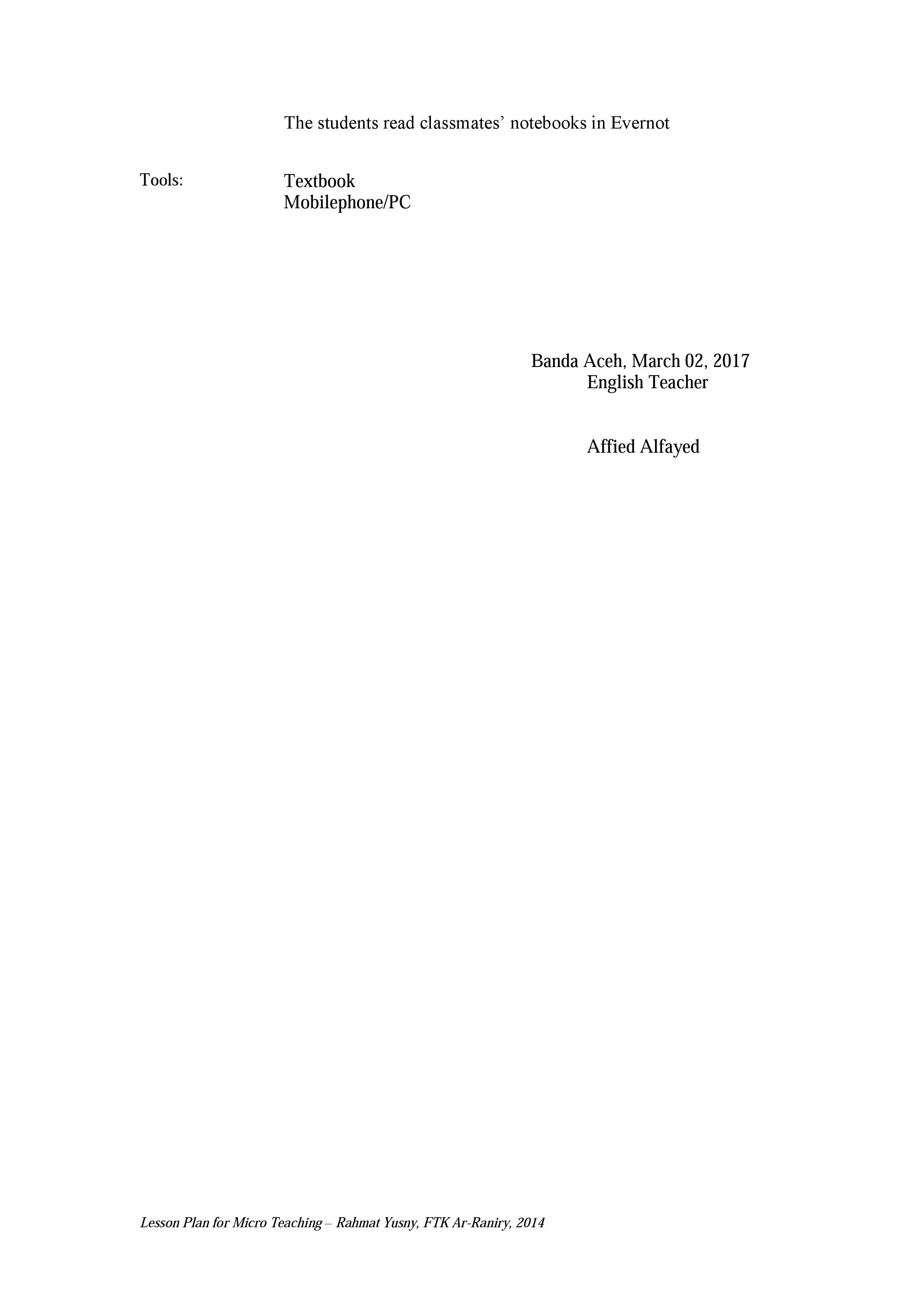 Lesson Plan plays an important role in what teachers and students are expect to do in the classroom. Therefore, it is important for teachers to write decide their instructional objective before they design the activities. Deciding goal and objective of learning is the first step of lesson plan that specifies activities, procedures and problems. To gain effective and useful objective of learning, a teacher needs to determine what students are expected to in learning the topic taught.