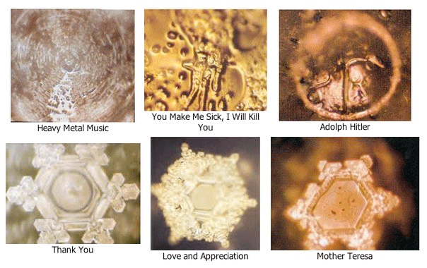 I have a book with images of the water. It's quite fascinating. At home, I take Bach Flower Remedies, and to help remember the remedy, I wrote key words under the name and stuck it on the bottle. It used to be for Pine, for example, I wrote Guilt, to know that when I feel guilty I take Pine, but it wasn't as effective. When I switched to positive affirmations, the Pine works a lot more effectively and removes the guilt. Now I write Self-Acceptance and Self-Forgiveness. I write the positive key words associated with each remedy on their bottle, which is mostly water, a drop of alcohol and a few drops of the remedy. So the water gets infused with the positive words.
