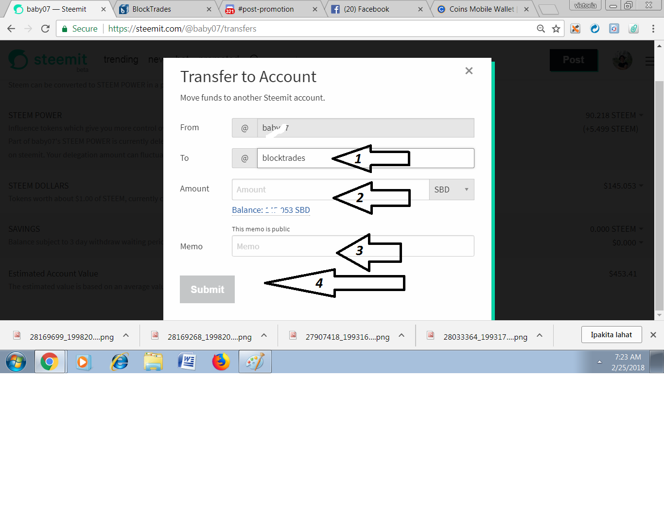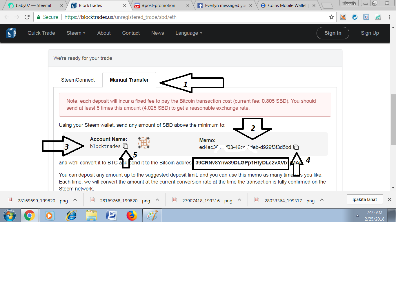 this is my illustration in bitcoin...but just like this it will ask you for manual transfer and the details you will use wil be given ., The memo to be used and the account name to transfer your sbd.