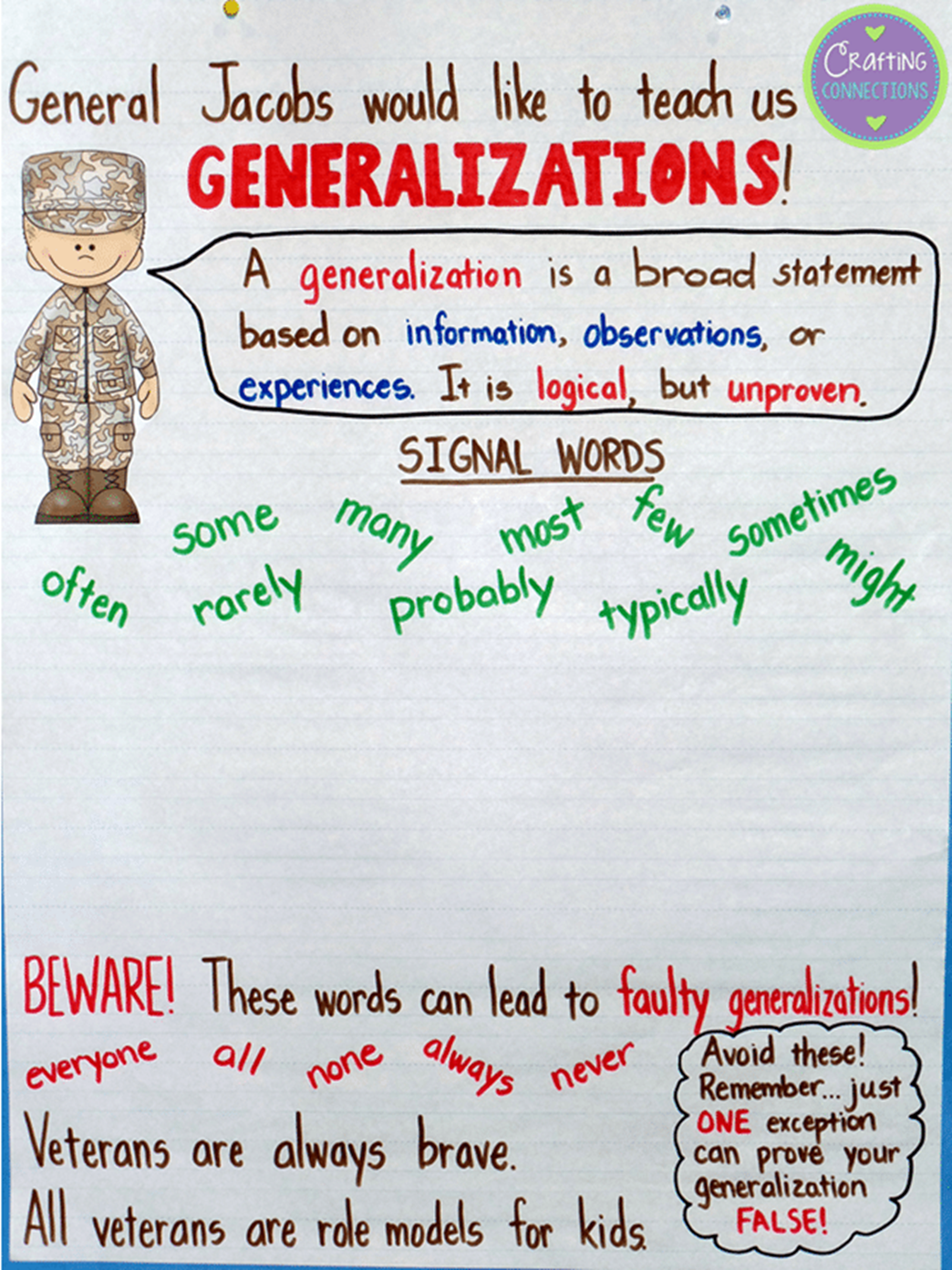 - Be careful when using the word "all," "none," "no," Everyone," "Nobody," "Always" and "Never". These are clue words that generally show "bad generalizations." "Always" and "Never" are very strong words. "Bad" generalizations may be faulty generalizations.