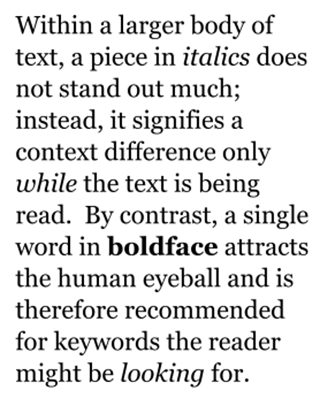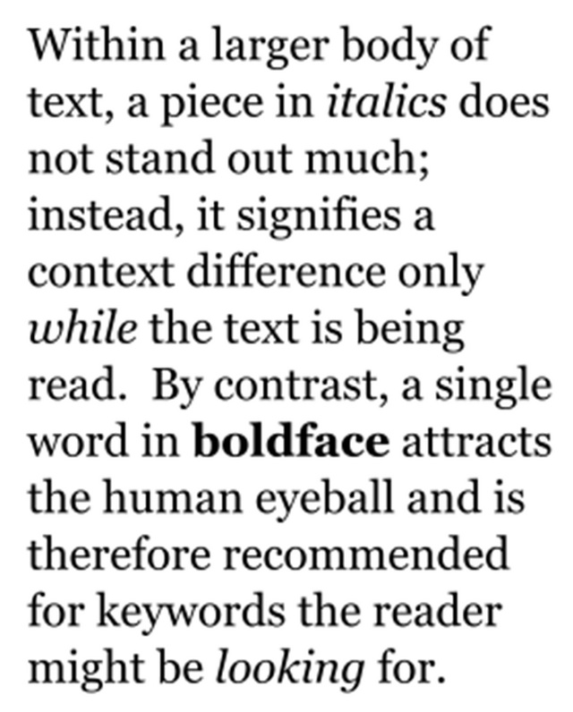In the days of the typewriter, to emphasise words, underlining was the standard. Underlining can still be used to emphasize but why underline when you have flawlessly good italics? Italics present a sophisticated and somewhat gentle form of emphasis. You notice the text in italics and it does not provide an in-your-face sort of emphasis.Bold