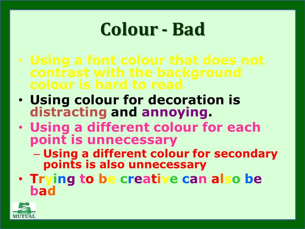 Do not use too many colours, it will have less impact and no-one wants to read a text that looks like a rainbow.