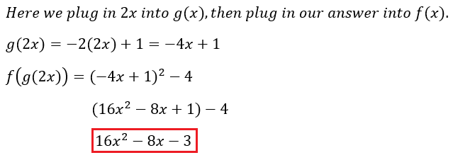 It is asking us to plug in g into f, replace all of the x's with 1/2x - 4, and simplify.