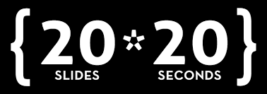 [PechaKucha 20x20 is a simple presentation format where you show 20 images, each for 20 seconds. The images advance automatically and you talk along to the images] (http://www.pechakucha.org/faq).