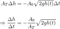 Now, the decrease in the tank volume is also equal to the cross-sectional area (AT) of the tank by the change in height. That is...