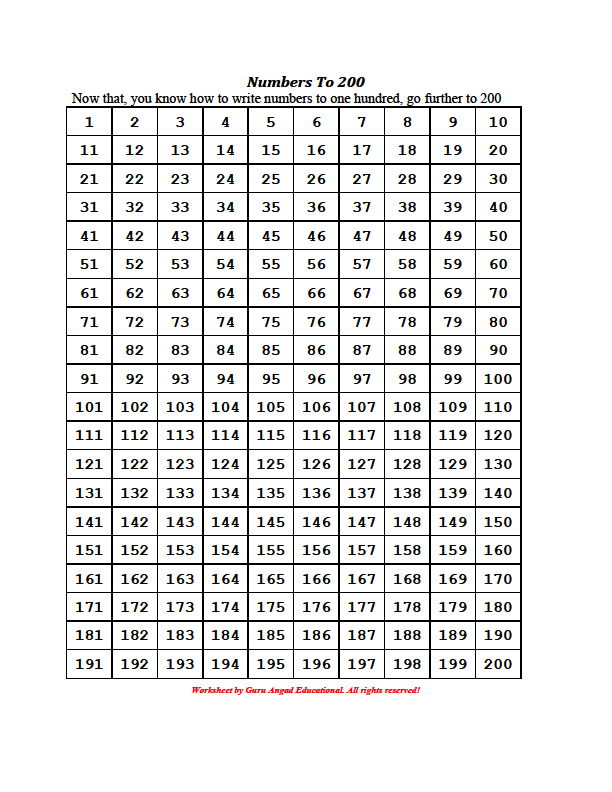 I created the following charts for 2nd grade kids to practice their counting skills. First chart is counting to 200 followed by the blank 200 chart. Please print the pdf version of the chart by clicking on the link given.