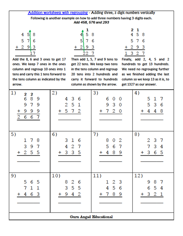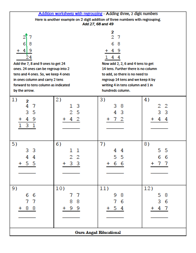 This post is continuation of addition strategies for 3rd grade math. We will discuss adding three or four numbers vertically. Kids get a lot of chances to practice addition with regrouping in the worksheets I am sharing in this post.