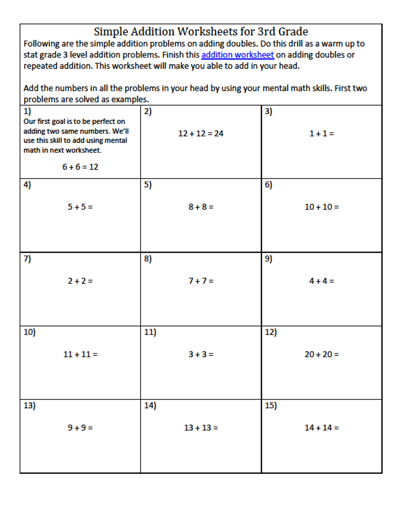 In this post we will start the very basic math operation of addition. In third grade math kids build up addition skills over what they have learned in second grade about addition. My emphasis is always on tricks which can be processed in mind to quickly come with the answer. For addition the simplest is to add the number to itself or we call it adding doubles.