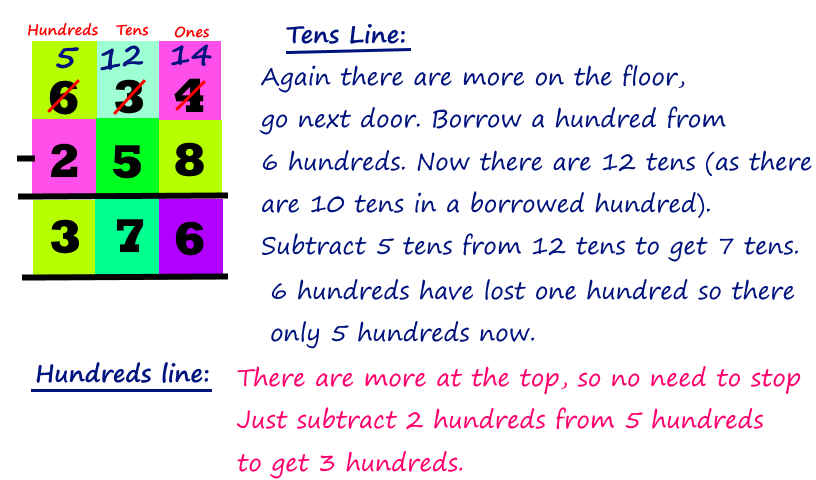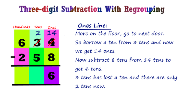 This post is continuation of basic subtraction strategies and today we will discuss three digit subtraction with regrouping. Once kids get the idea of subtraction with regrouping using two digits, 3-digit subtraction with regrouping is very simple for them. Instead borrowing once they have to borrow twice. Just remember the following poem;