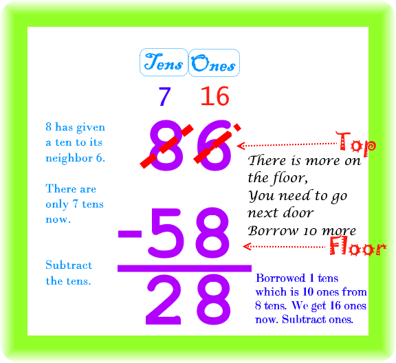 In this post we will discuss a very important subtraction strategy which is subtraction with regrouping. There is a poem which can be used to stick to the concept;