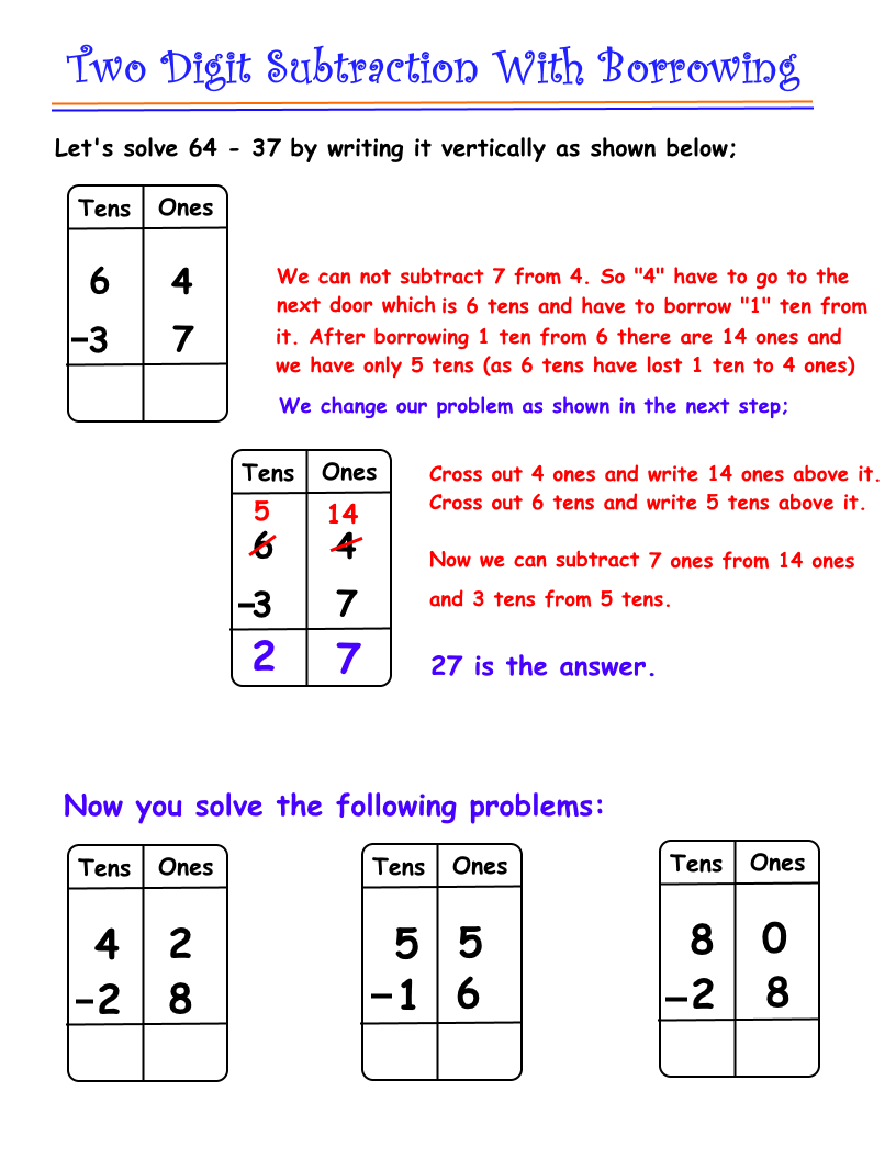 The concept is keeping the answer positive after the subtraction and for that we need to borrow from the digit on the left hand side. This strategy is very much opposite to addition with regrouping. There is one worksheet on the concept and kids need to do all the problems in the worksheet to get a good grasp of the concept;