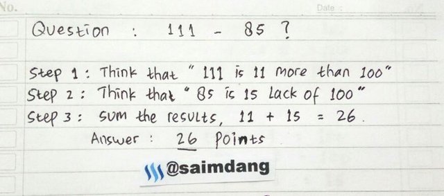 The quick trick to get the answer, we must add up the difference of two numbers with 100. In using this trick, one of the numbers must be more than 100, and the other number must be less than 100. In the example of basketball score above, the score is 111 more than 100 and 85 less than 100. To get the answer, ask in your mind what the number is between 111 and 100. Similarly, the distance of the numbers between 85 and 100. Sum both the number of the distance. That's the answer.
