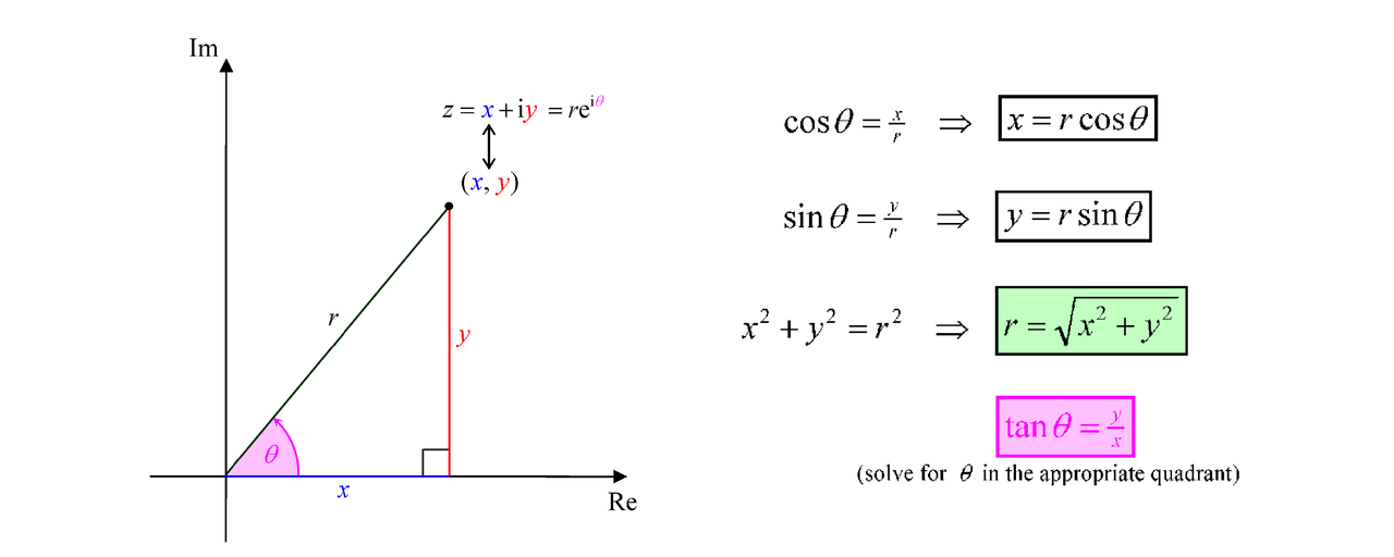 Every complex number z = x + i y, represented by a point Z(x, y) on an Argand diagram, can be expressed succinctly as , where r is the "modulus" or distance of the point to the origin O and