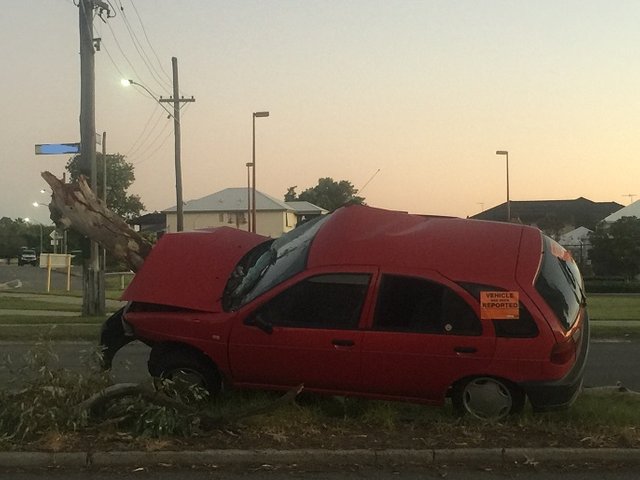 This Red Car was left for over two weeks after the crashed , as you can see; a notice by the City Council to remove it.