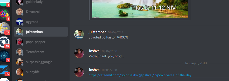 As for the community, here in Steemit I was encouraged to stay positive. I haven't met any Steemians yet, who joined earlier than me, but I have develop friendship through the discord channel in the person of @julstamban who is from a very far region from our place. He's been so supportive in my posts though we haven't met yet in person. And also sir Terry a.k.a @surpassinggoogle, who is supporting the Filipino Steemian Community. How I wish I could meet them in person one day!