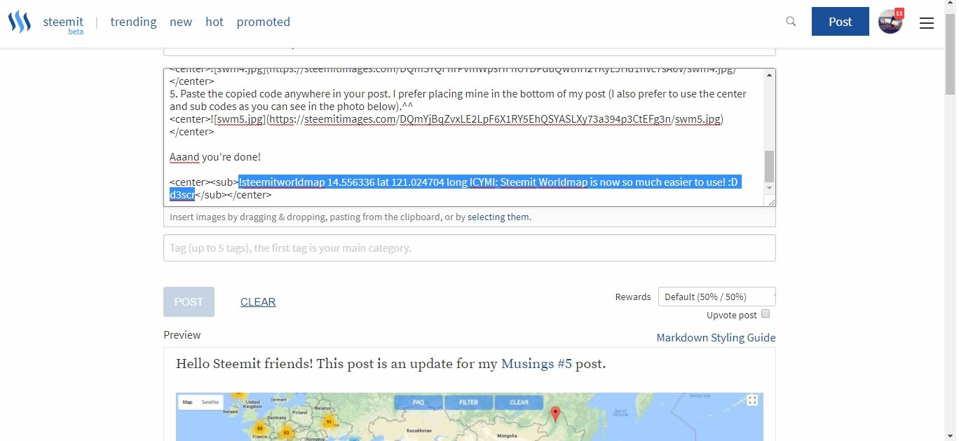 As you can see in my last post, there was confusion in using the map codes. And it certainly didn't help that I had my draft typed in a doc file, which messed up the links when I copy-pasted it here on Steemit and posted it. Anyway, the good news is that the makers of @steemitworldmap, @martibis and @blueorgy, came up with a wonderful solution you'll dig. Now you won't need to type in the codes yourself. YES! You read that right!^^ Here's what you need to do in 5 simple steps (with photos!):