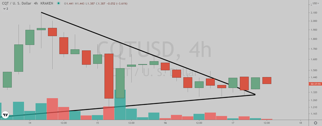 Covalent (Kraken: CQTUSD) has broken out of the triangle pattern in the four-hour chart.