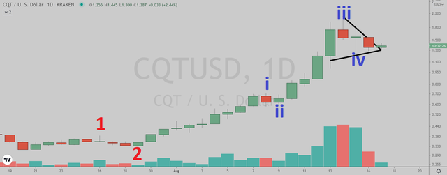 Zooming out in the daily chart, I believe CQT is currently in the red wave three (blue sub-wave v). The red wave one began on July 20 and the red wave two correction ended on July 29.