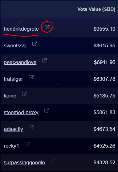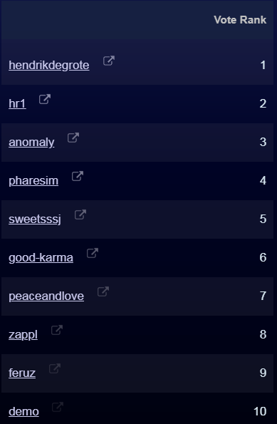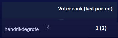 Moving down to the tables on the home page, it is very useful to have the links to the user's account page on Steemit but also a handy link to the voter rank table page for that user: