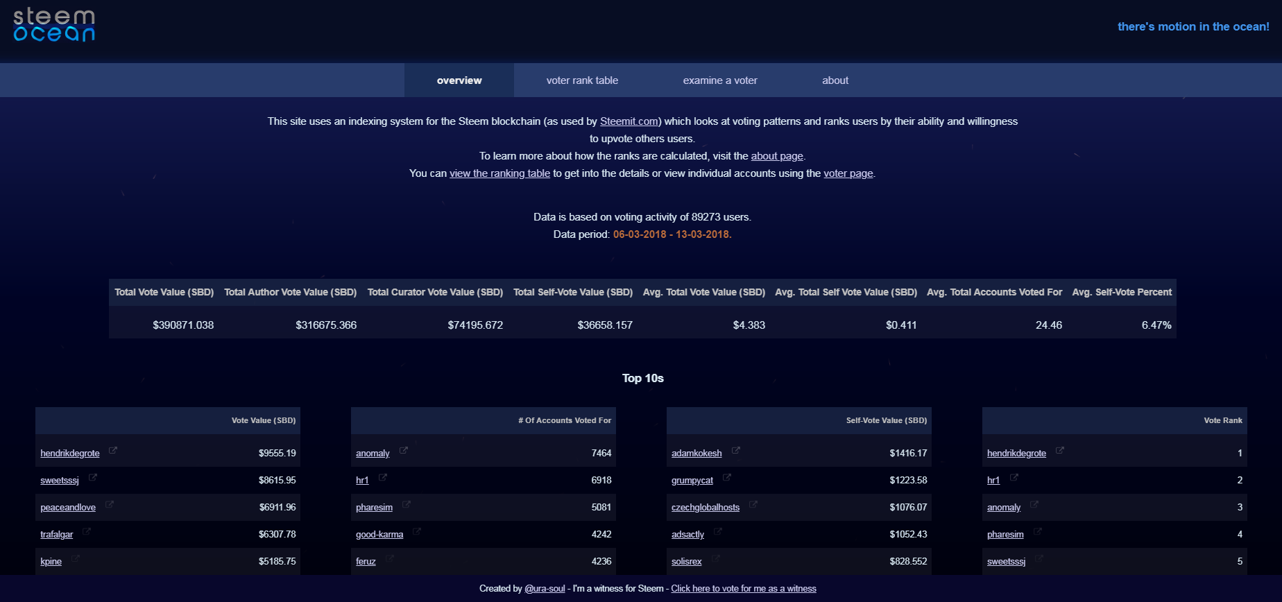 But I like the fact that I can look more closely into my voting activities as well as those of other people, and along with Asher's League of Excellence (by@abh12345) and the Alternate STEEM TOPs (by @t3ran13) they all combine to give us different perspectives into what is happening underneath the currents of the Steem Ocean. Would be interesting to compare and contrast the different methods as well (but maybe another post).