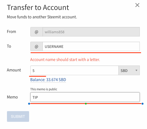Step 3 - Input your username you would like to send to, the amount, and the MEMO you would like to send! All requirements are lined with RED!