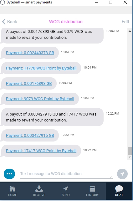 每日,他会自动把今日得到的WCG分数转换成byteball转到Byteball钱包。