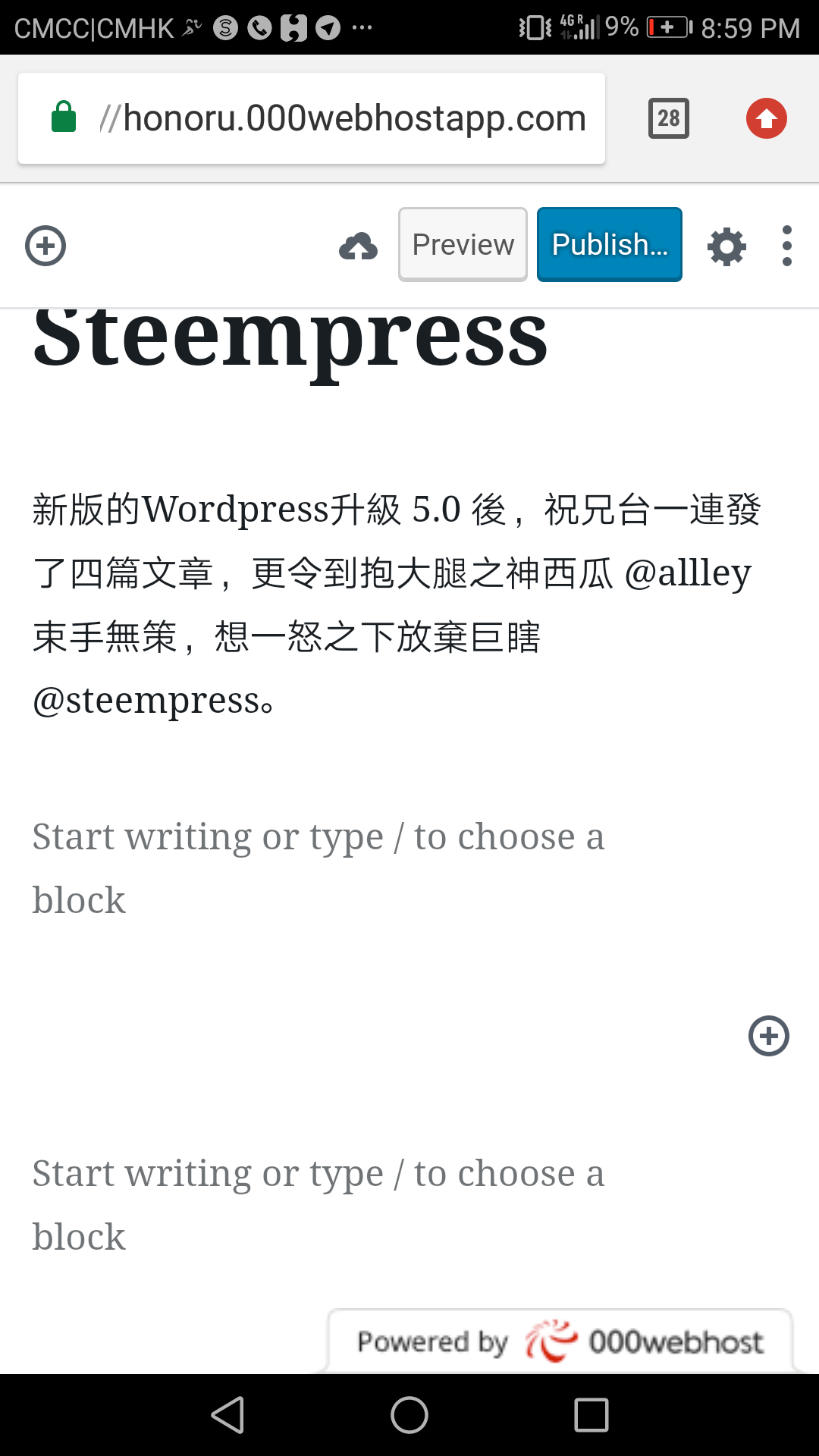 新版的Wordpress升級 5.0 後,祝英台 @livinguktaiwan 一連發了四篇文章,更令到抱大腿之神西瓜 @aellly 束手無策,想一怒之下放棄巨瞎 @steempress。