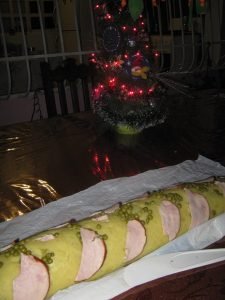 Agarramos el plástico y vamos enrollando poco a poco la capa de puré con el atún hasta llegar al final, moldear las puntas para cerrarlas. Por último agregar el jamón ahumado y los guisantes para decorar. Lo puedes acompañar con una ensalada de lechuga, tomate y cebolla.