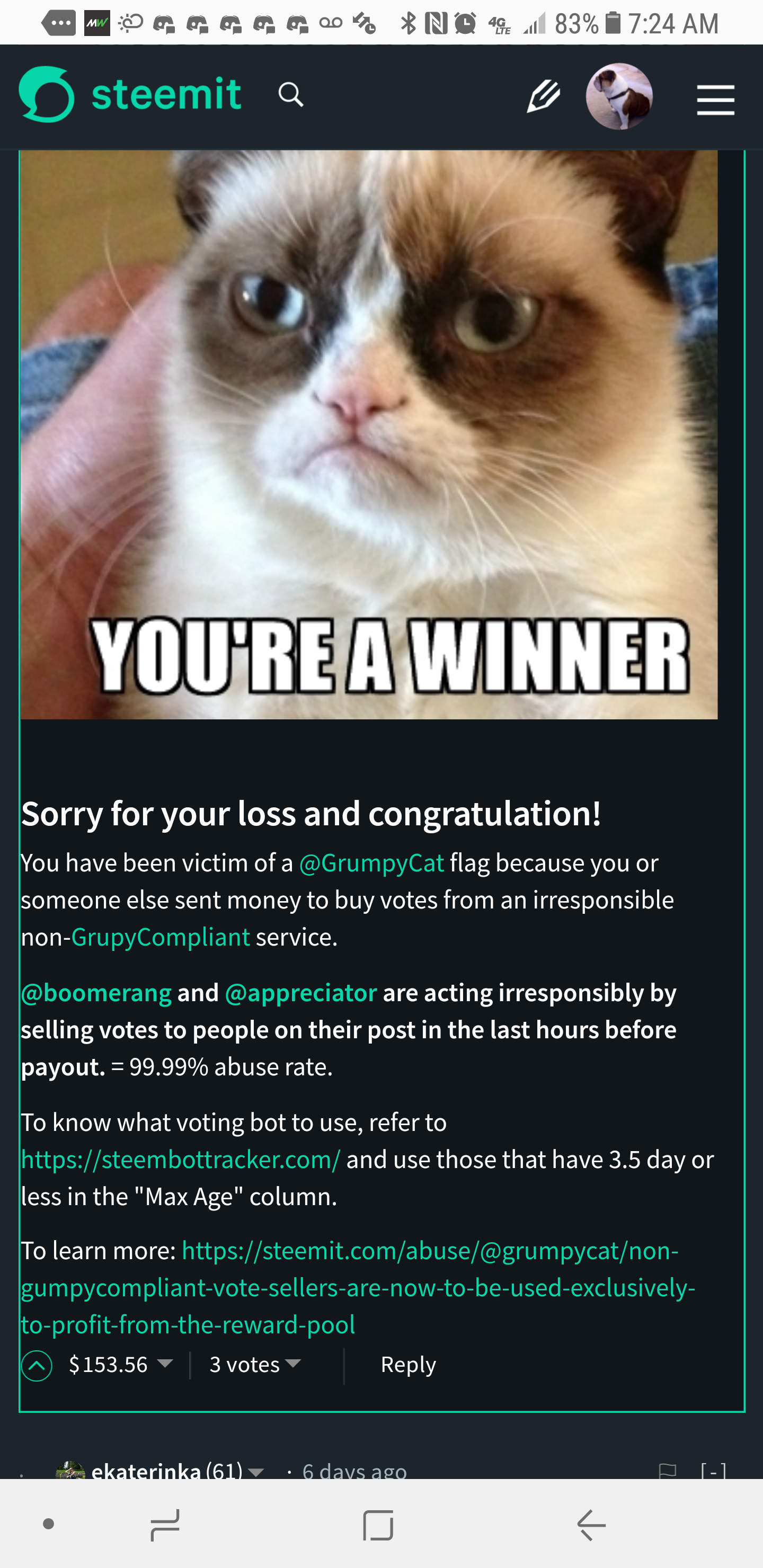 What is the deal this damn cat, why won't you just leave everyone alone? You claim to be protecting the rewards pool against bots that will allow you to upvote past the 3.5 day mark. Yet you punish everyone that uses what ever bot you maybe attacking that day. You yourself have used all of these vote bots. Seems to me that you may be talking out of your ass. You see I believe you are the one that is rapping the rewards pool. You seem to upvote just about all of your own comments.