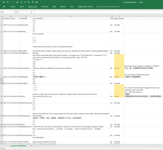 Now, who gave the answer according to the format I want which I consider as participating. Let's fine tune the SQL. I want the comment like '%1%2%3%' to be considered as entry. But who then is the winner? My answer is 1-F 2-S 3-A. That means must fine tune the SQL some more so the comment must be like '%1%F%2%S%3%A%'. Were there any? Let’s see my updated SQL query.