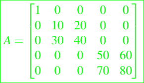 En general, una matriz A = (aij) tiene un ancho de banda inferior si aij = 0 siempre que i > j + p. Así, una matriz triangular superior tiene un ancho de banda inferior de 0 y una matriz tridiagonal tiene un ancho de banda inferior de 1. Una matriz A = (aij) tiene un ancho de banda superior de aij = 0 siempre que j > i + q. Por lo tanto, una matriz triangular inferior tiene un ancho de banda superior de 0 y una matriz tridiagonal tiene un ancho de banda inferior de 1. Aquí hay una matriz con ancho de banda superior 2 y ancho de banda inferior 3: