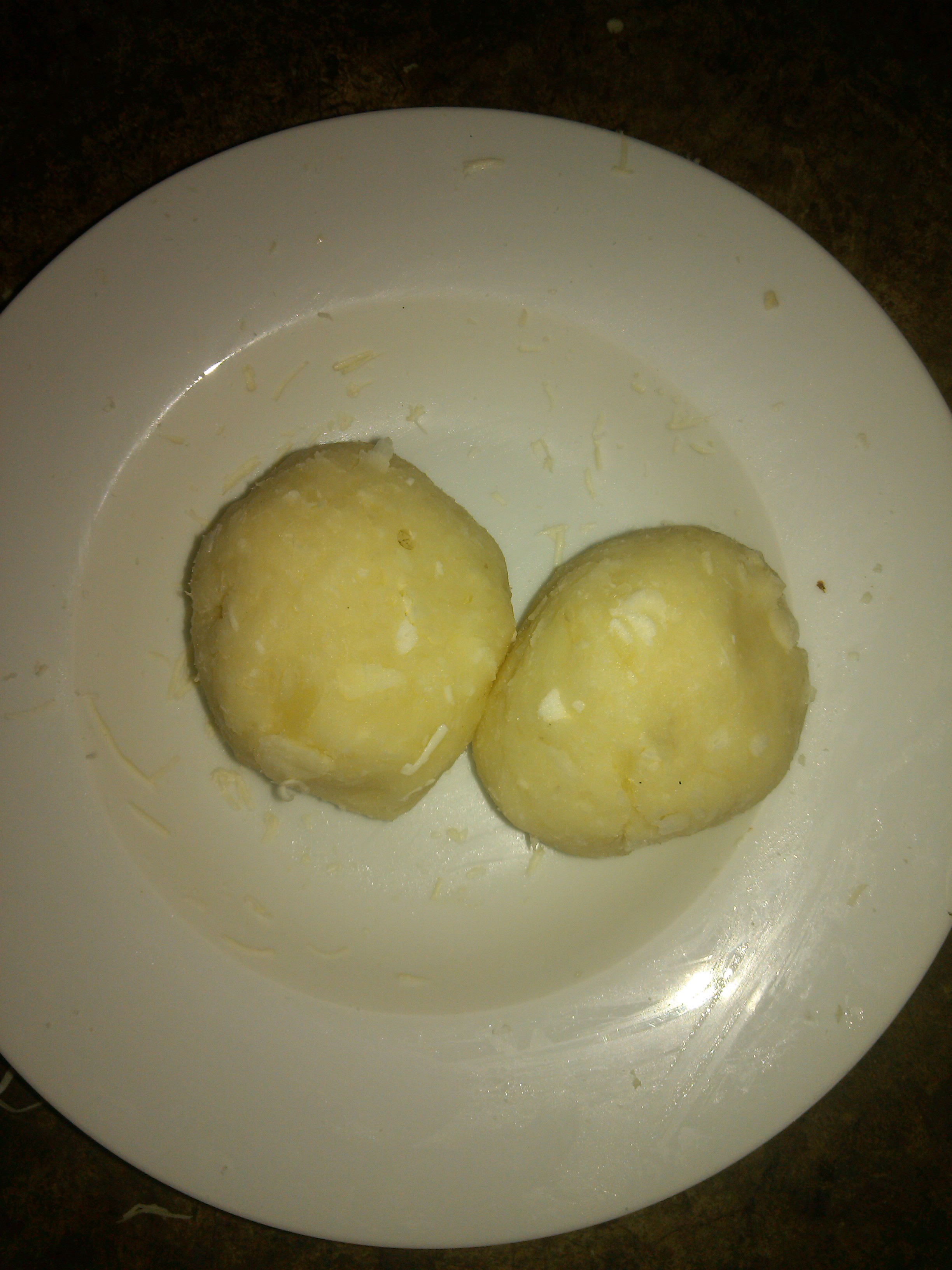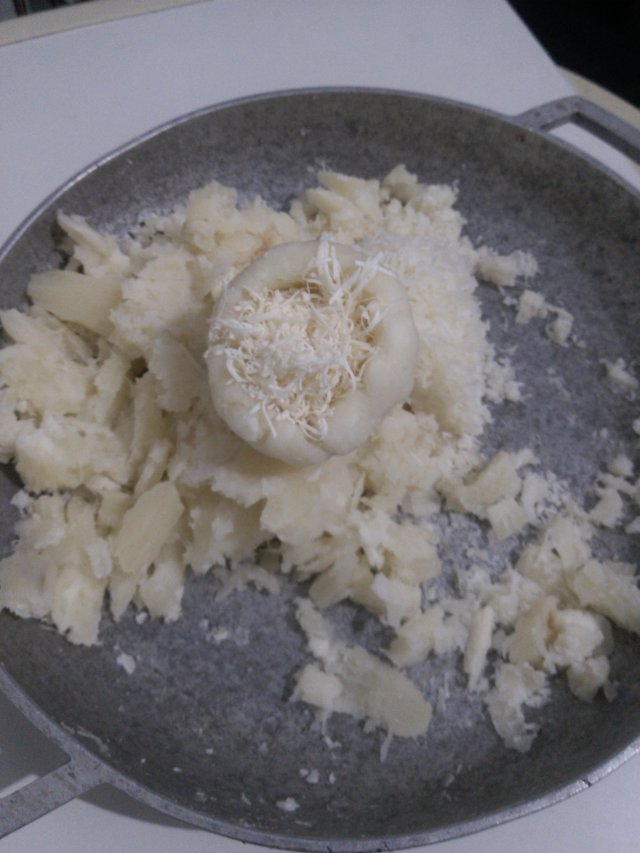 3 - Grated the cheese to taste, then grab the mixes and make a ball all in part equal, then we form each ball in the form of a letting rate to fill it with cheese, then close the heard leaving the cheese inside of the yucca ball.