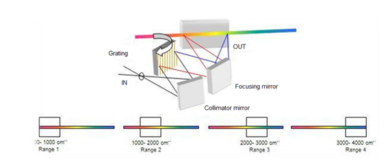 When the laser light is captured by the head of the spectroscope and in turn takes it by means of optical fiber, this signal finally arrives at the monochromator, whose main objective is to capture said signal sent by the laser and separate the components of the specimens. Said component is formed mainly by the grating, inlet and outlet slots, mirrors, collimator.