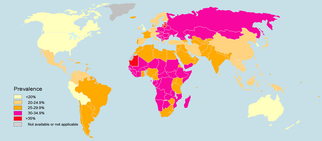 The picture above shows the prevalence of hypertension in the world in 2014. Canada is one of the countries with the lowest prevalence although the average consumption by Canadians is 3400 mg/day, that's way higher than the recommended intake !
