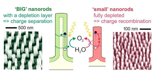 Two groups of tungsten oxide nanocolumns with different radius and height (70/700 nm on the left and 13/130 nm on the right). The large nanocolumns are more effective in the photoelectrochemical separation of water since the photogenerated charges do not recombine rapidly as it happens in the small ones.