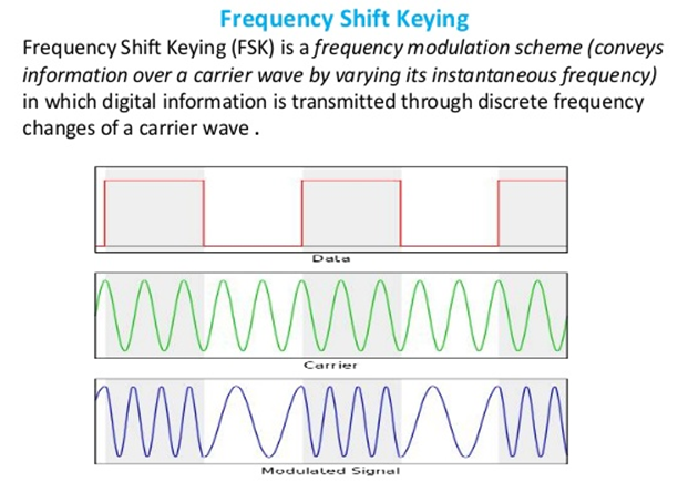 - A sinusoidal signal of lower frequency is observed in the output signal when we have a binary 0 and a higher frequency for a binary 1. Which complies with the theory (see image shapes of modulated signals)