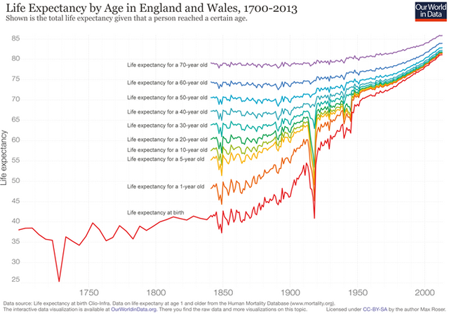 The graph below shows how improvements in health of children less than 5 years-of-age largely fuelled this development. However, in the last few decades even those that made it past childhood have seen substantial life expectancy increases.