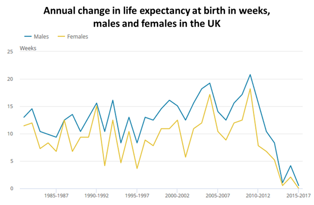 Secondly, the rate of life expectancy increase dropped off dramatically here in the UK, far quicker (only over the last ten year) than we would perhaps expect if we hit some sort of hard cap.