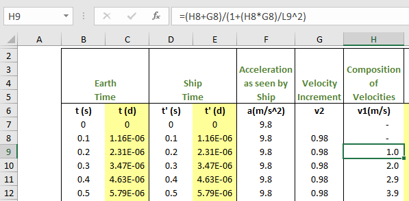 In essence the clocks on the ship will slow down and the time increment will decrease by a factor called the Lorentz term. That term is calculated in Column M which I will be getting to.