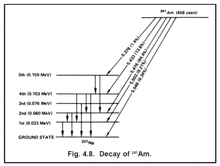 Diagram of Am-241 decay, a good example of a gamma emission event. This nuclear reaction takes place thousands of times per second in many smoke alarms.