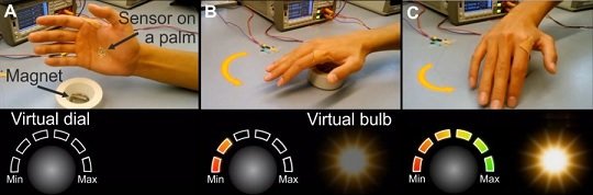 Awesomely enough is the fact that this new e-skin can create electro-magnetic interferences, which makes it possible for them to manipulate objects through magnetic interactions. These interactions are dependent on the varying voltage emitted by the e-skin, and the angle tilted by the hand of the wearer. Just like the image shown below (controlling light bulb with the electronic skin).