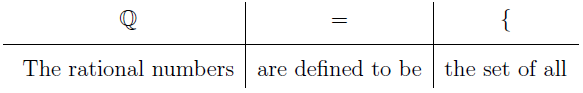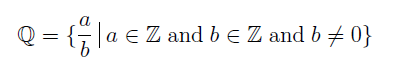 “The rational numbers is defined to be the set of all fraction of the form a/b such that a is an element of the integers (Z) and b is an element of the integers (Z) and b is not zero.”