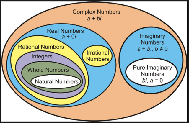 Natural numbers are contained in integer, an integer is contained in rational numbers, and rational numbers are contained in real numbers, and all real numbers are contained in complex numbers. Refer to the image below for visualization.