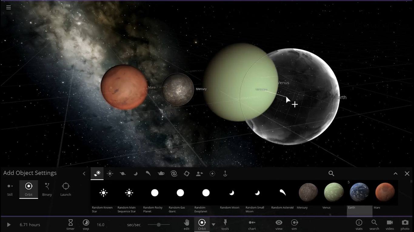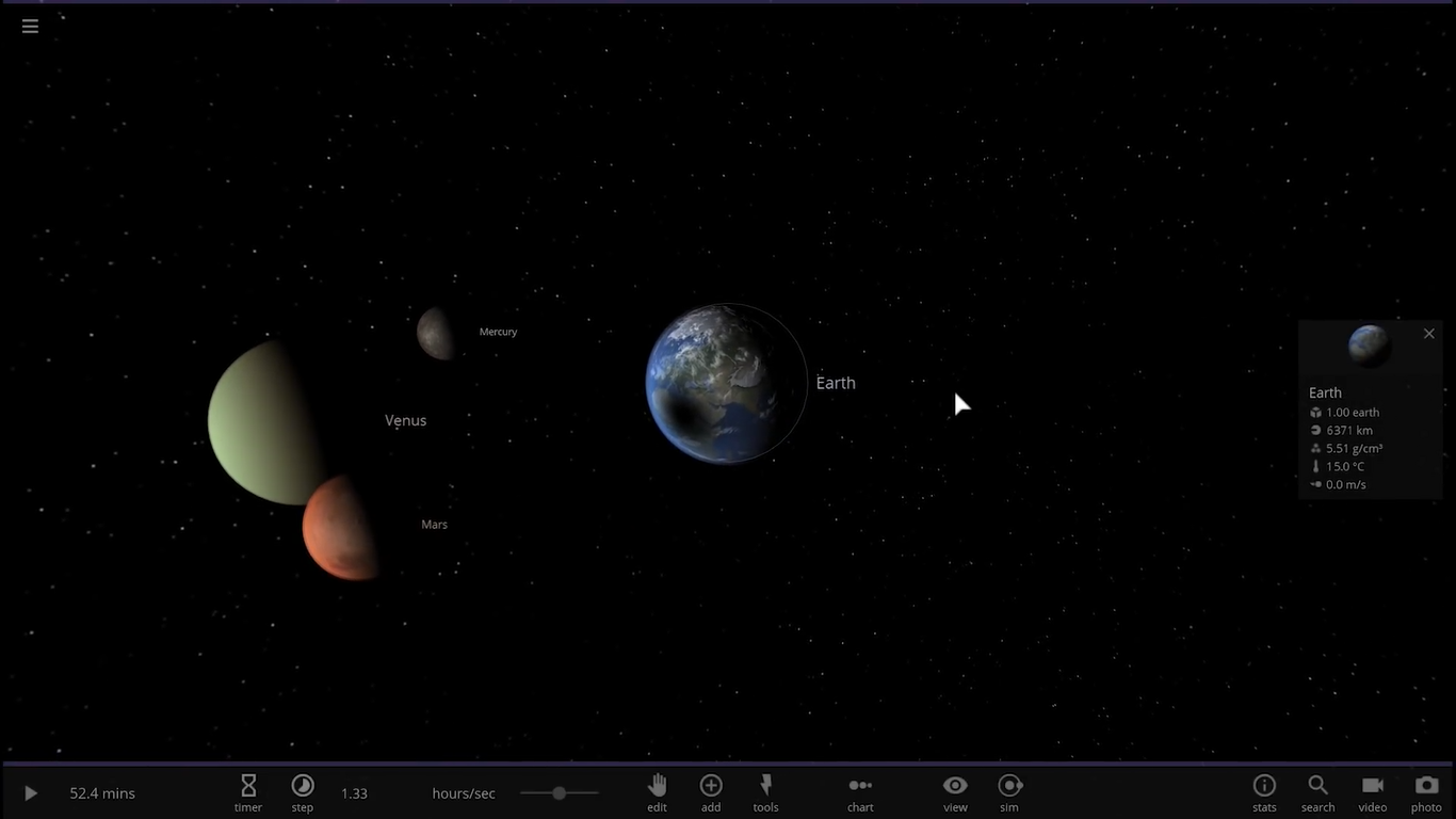 We are going to create a new simulation and take Mercury and put it first then take Venus which is going to be a lot larger in terms of size and mass and then take Mars. So, let's just put it in between. We are not going to place Earth just yet. But you can see it in the background and in terms of sizes I guess it's sort of comparable. So, let's just go and collide them and see what happens! They started colliding with each other in a few seconds and as they do collide and basically collapse into a single object you're going to start noticing something very unusual and we are going to show it to you in the below.