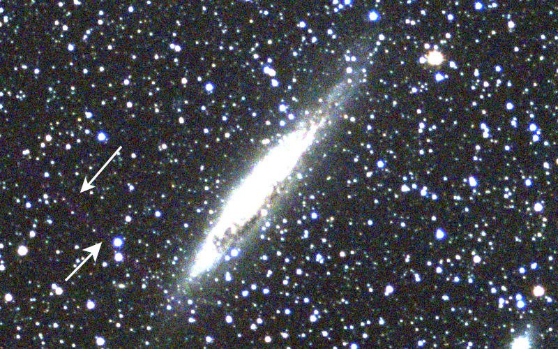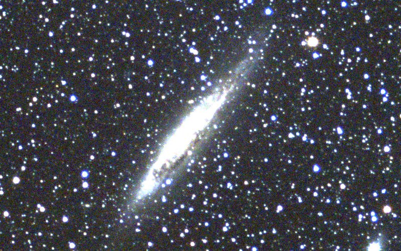 The following image is a median stack using the same image set as the one used for the previous image. Notice that the trail is almost gone (only a faint trace can be seen). The median stacking method is much slower than summation and it may be just as effective to remove the flawed image from the image stack if the number of photos is large.